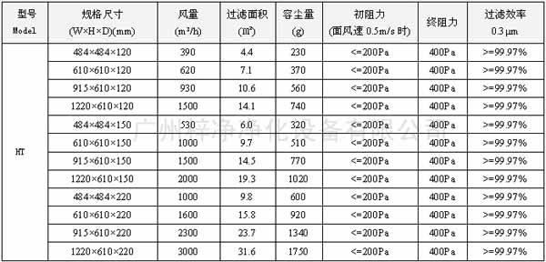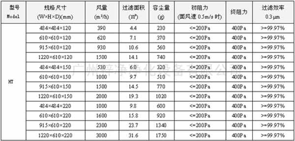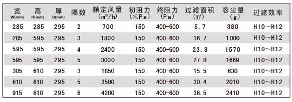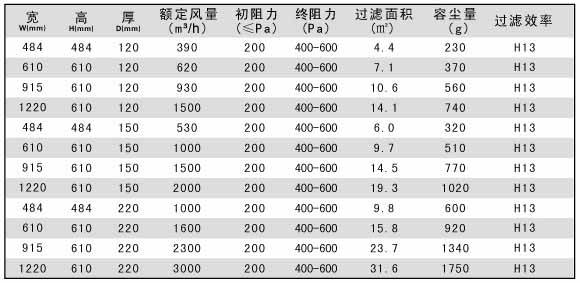 有隔板高效过滤器规格尺寸及风量容尘量技术参数: