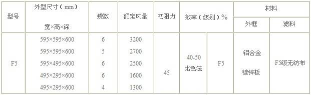 F5级袋式中效过滤器型号尺寸及其它参数:
