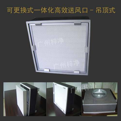 可更换式一体化高效送风口:由静压箱和无隔板高效过滤器组成,采用铝型材做静压箱,箱体内置无隔板高效过滤器。该送风口具有通风性强、外形美观、安装更换方便、维护简单、投资少、重量轻、厚度薄、过滤效率高等优点。