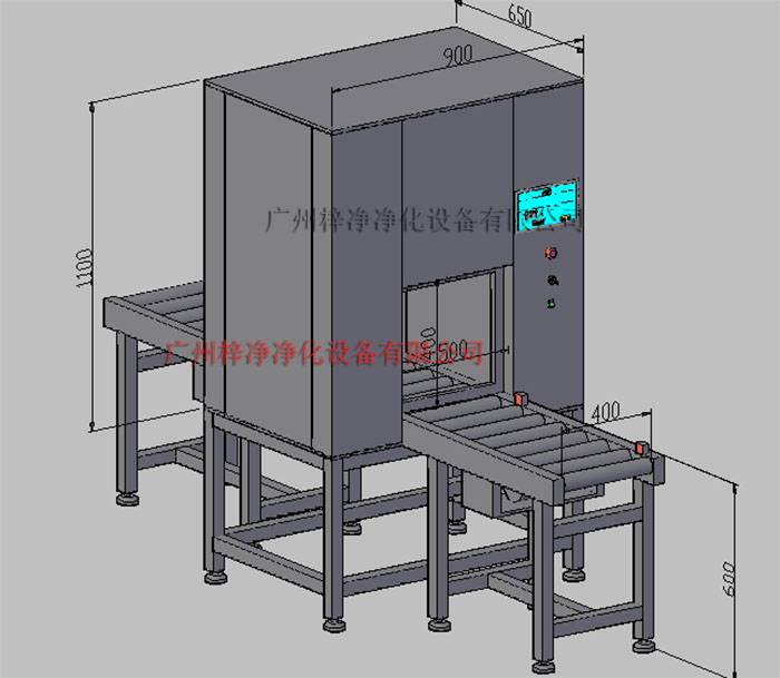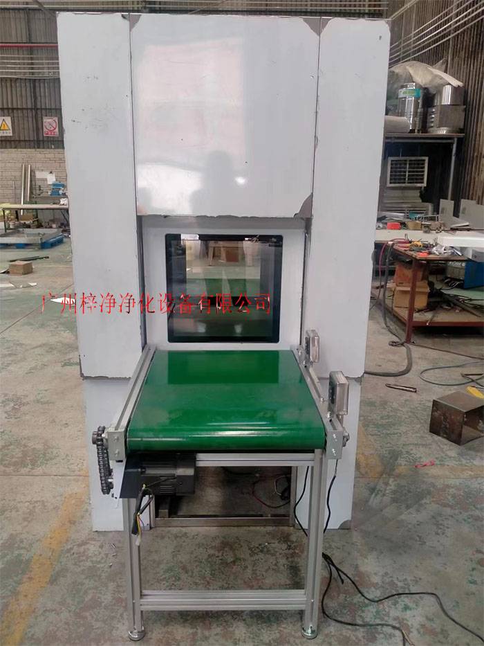 输送带传递窗在传递物料时,顶部吹出高速、洁净气流,吹除货物表面的尘粒,此时,两侧门可以打开也可关闭,洁净气流起到气闸作用,以保证洁净室室外的空气不会影响室内的洁净度。