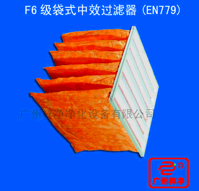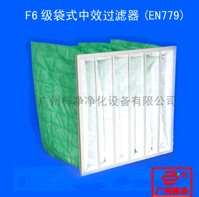 F6袋式中效过滤器(无纺布滤料颜色为绿色) F6级袋式中效过滤器广泛用于电子,精密仪表、机械、冶金、化工、纺织、医药,食品等行业的空气净化过滤等行业。